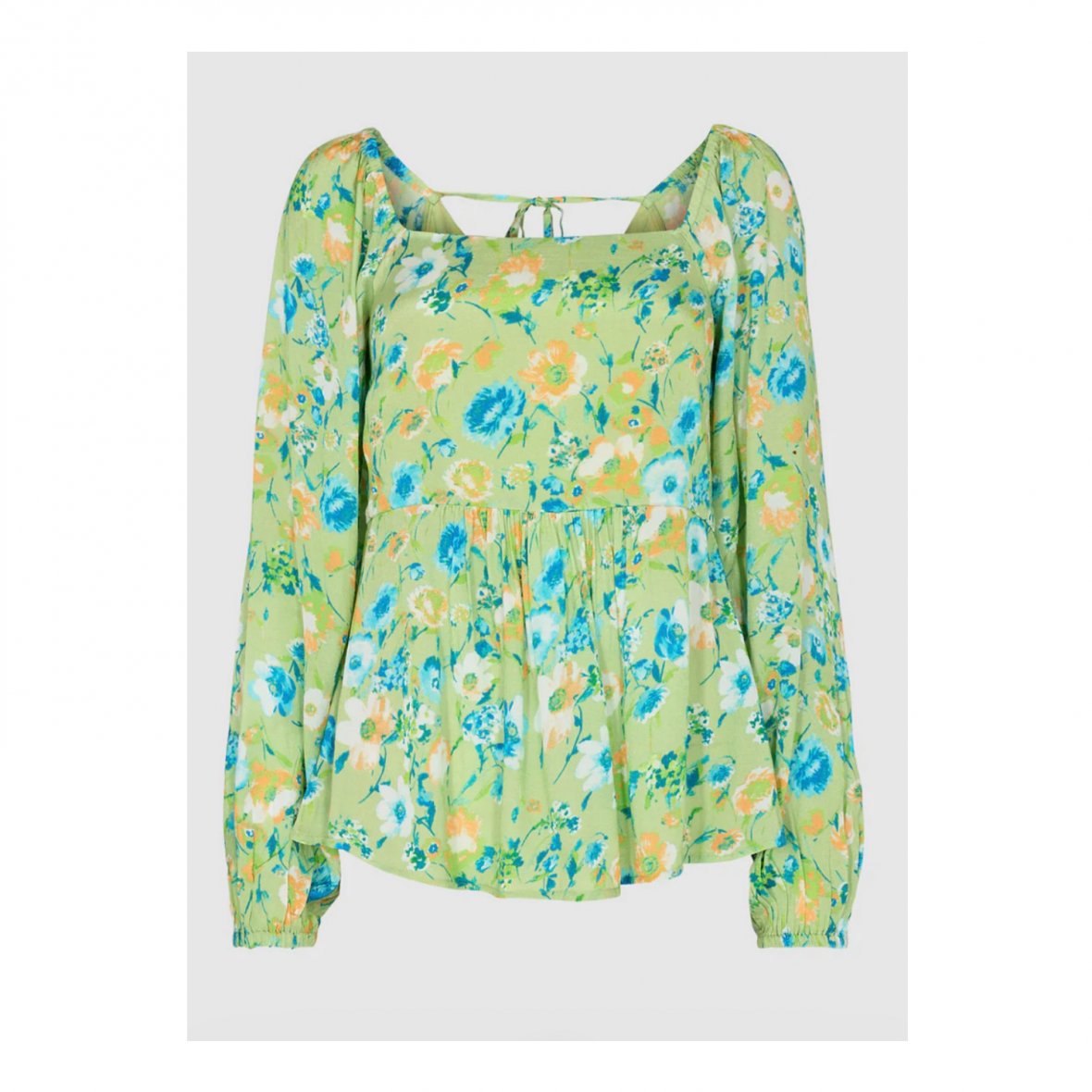 Blusen er med cutlines i taljen, voluminøse ærmer med elastik manchetter, lynlåslukning på ryggen og en dyb firkantet halsudskæring