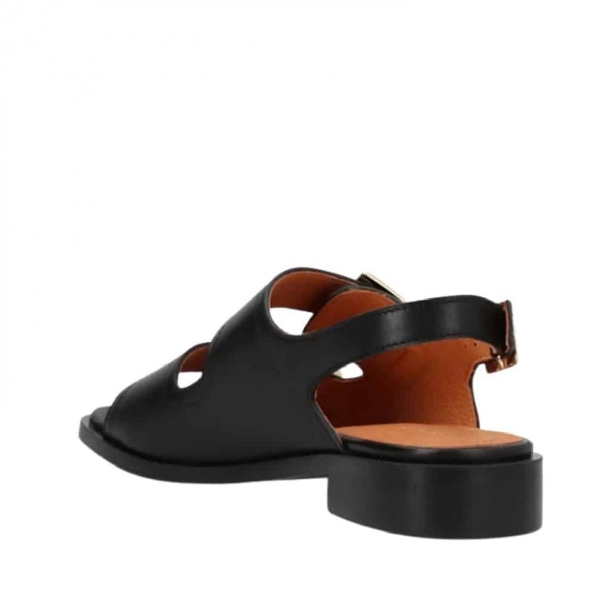 sandalen er med 3 remme med guldfarved spænder og er med en fin blok hæl og åben tå